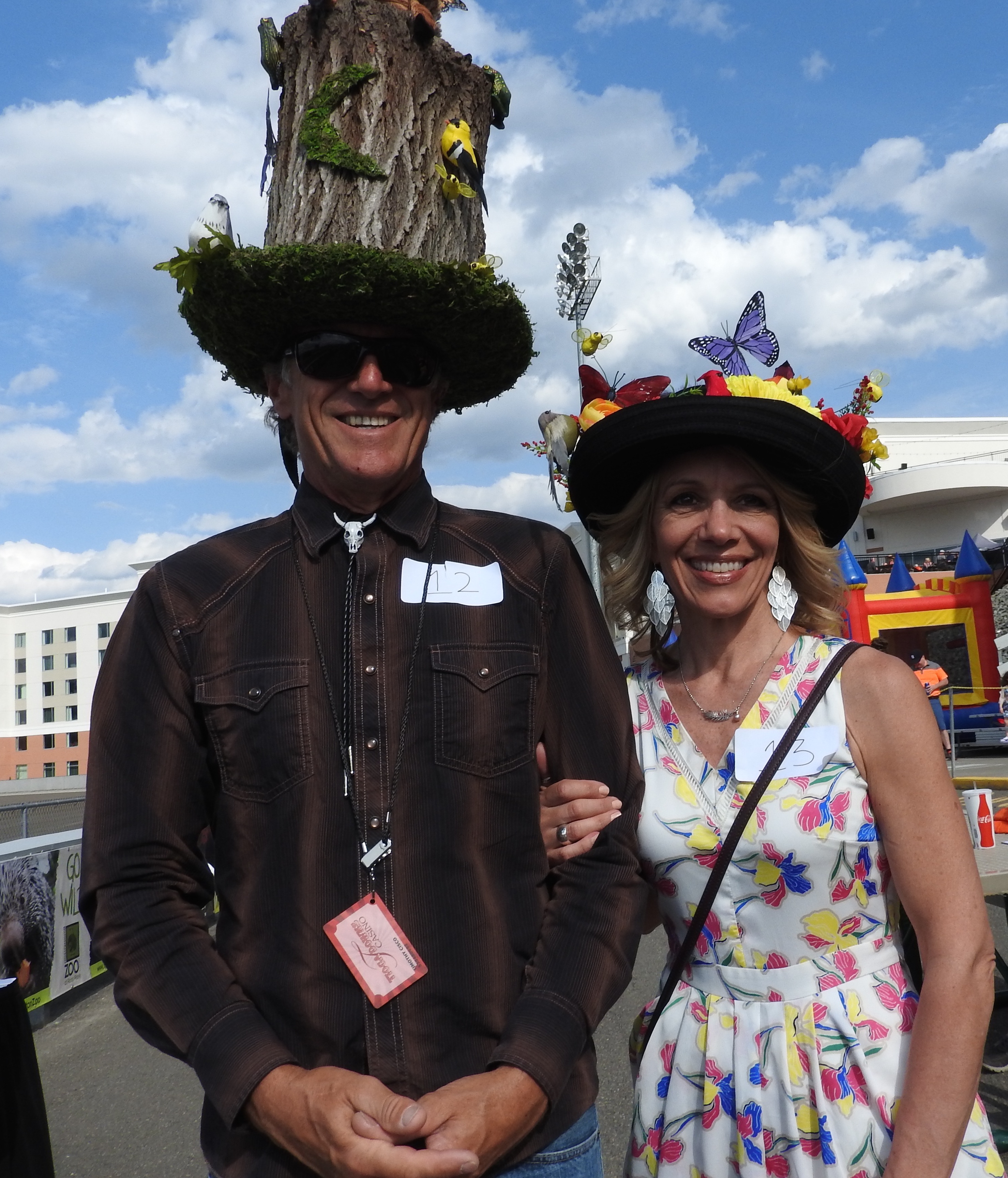 Tim Cisco, of Lewes, Delaware, won first place this year in the Derby Hat contest held at Tioga Downs in Nichols, N.Y. on Saturday, and on the opening night of Harness Racing. Cisco, who was visiting the area with his wife, Shiela (Treat) Cisco, had a hat designed as a woodland creature. Cisco is from Wellsboro, Pa., and his wife is from Lawrenceville, Pa. The two stated that they come home to visit from time to time, and that they love to visit Tioga Downs when they are in town. Here, they are pictured trackside following his first place win. The hat contest was held earlier in the day, and as guests were arriving for the kick off of harness racing, and to watch the Kentucky Derby, televised. (Photo by Wendy Post)