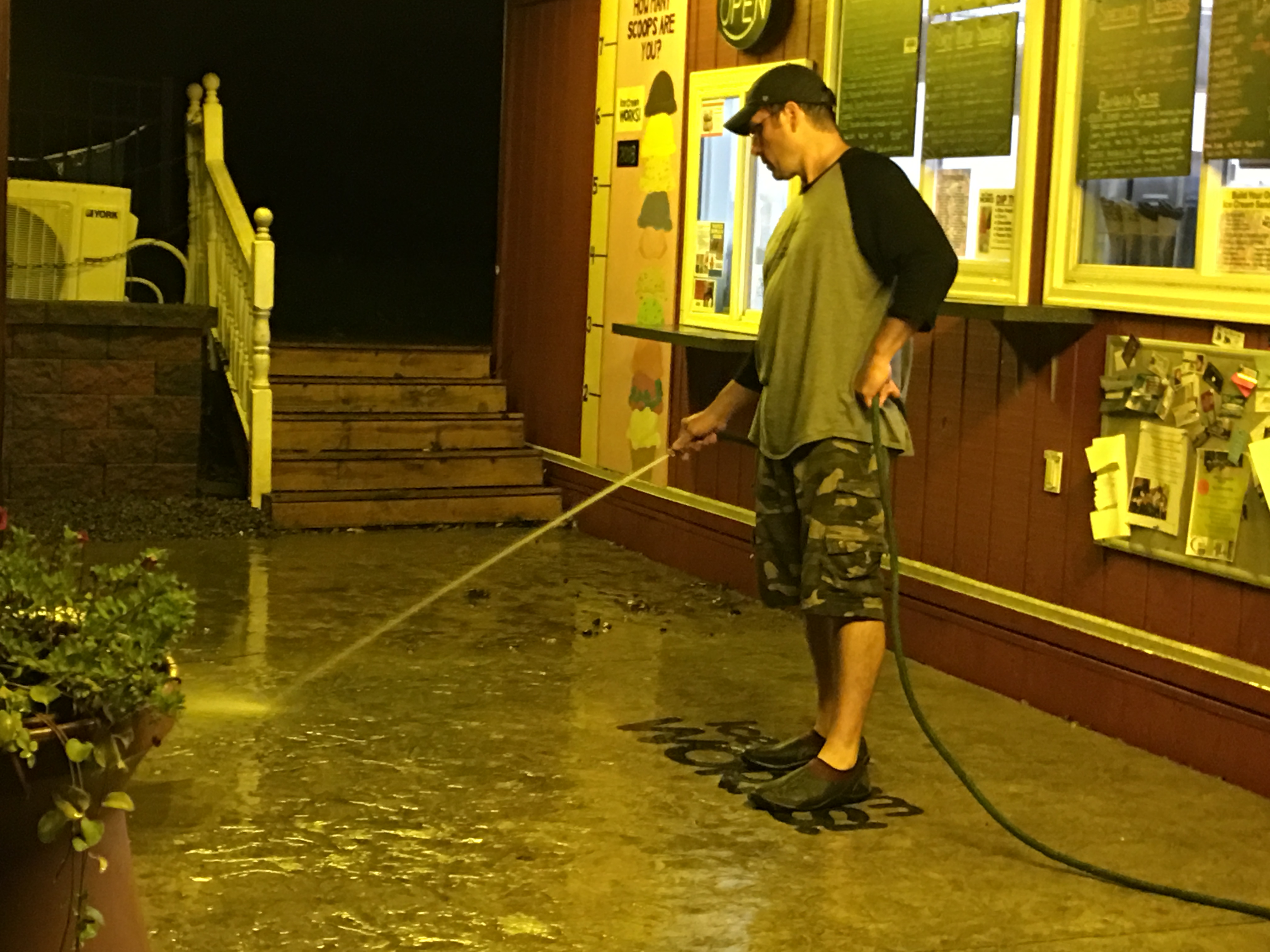 Michael Franz hoses off the patio at Ice Cream Works! Tuesday evening. Water came off the mountain onto North Avenue, and then traveled, along with debris, down George Street. Franz said it looked like a waterfall. (Photo by Wendy Post)