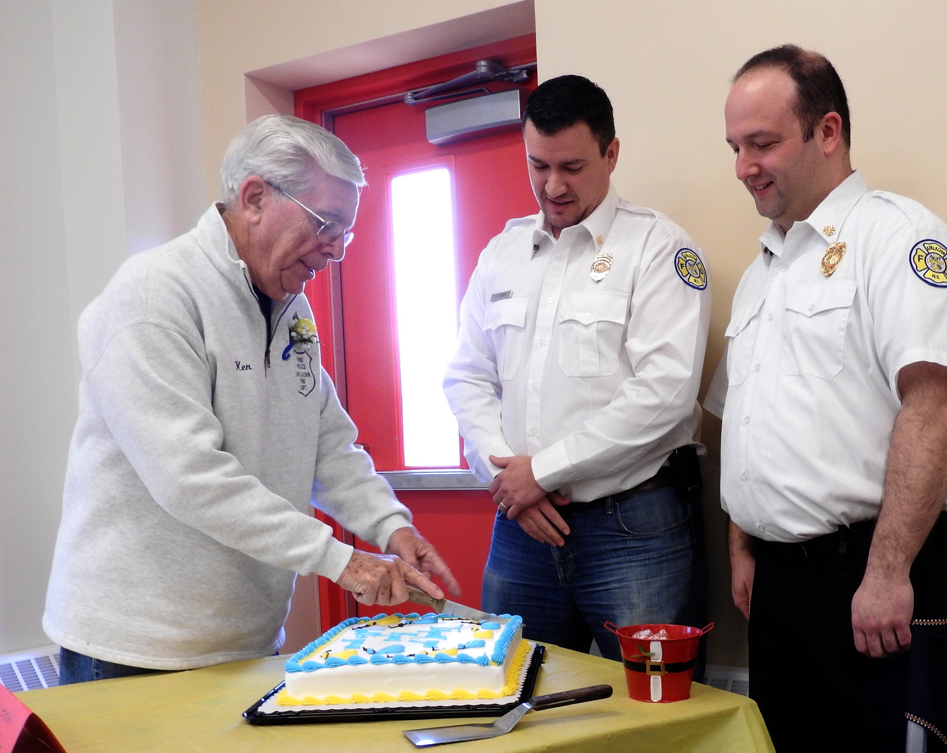 Ken Brinkman, left, cuts the cake during a celebration held in his honor last Sunday at the Apalachin Fire Station. Pictured, looking on, are Apalachin’s Fire Chief, Mike George, and the Chairman of the Board of Fire Commissioners in Apalachin, Brian Rieber. (Photo by Wendy Post)