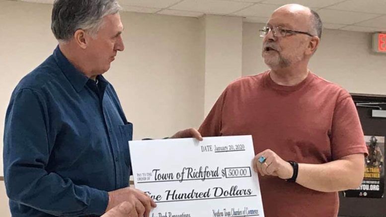 At the yearly “Tailgate Kickoff” party of the Northern Tioga Chamber on Monday evening, Jan. 20, Mer Barrett, president of the Northern Tioga Chamber, presented Charles Davis, superintendent for the Town of Richford, with a check in the amount of $500 to be used for ongoing development of Rawley Park.