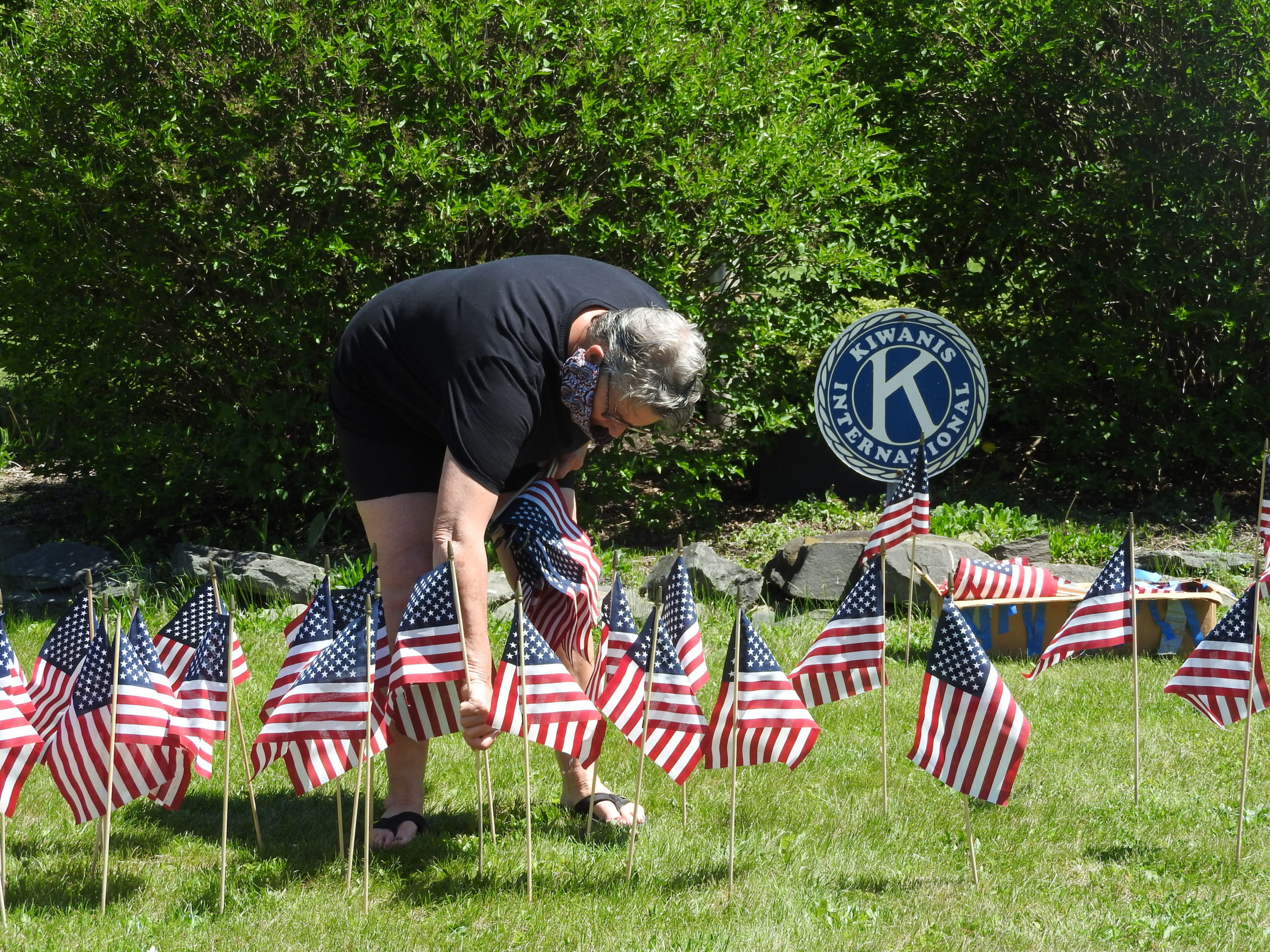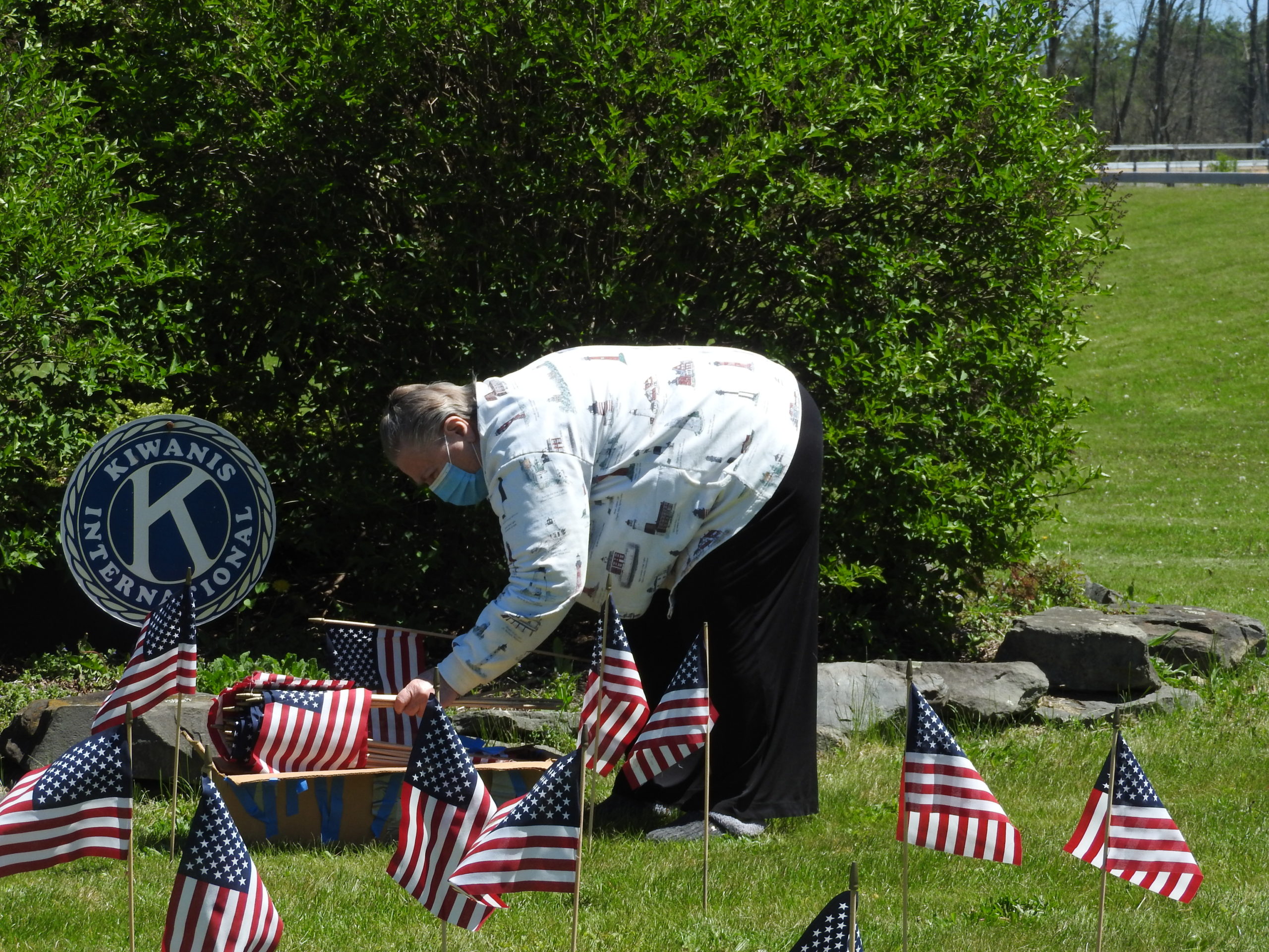 Kathy (Nichols) Newell, member of Owego Kiwanis, volunteered her time to place the 288 flags on Thursday at Exit 65 in Owego, and near the flagpole, where a flag is flown at half mast during this pandemic. (Photo by Wendy Post)
