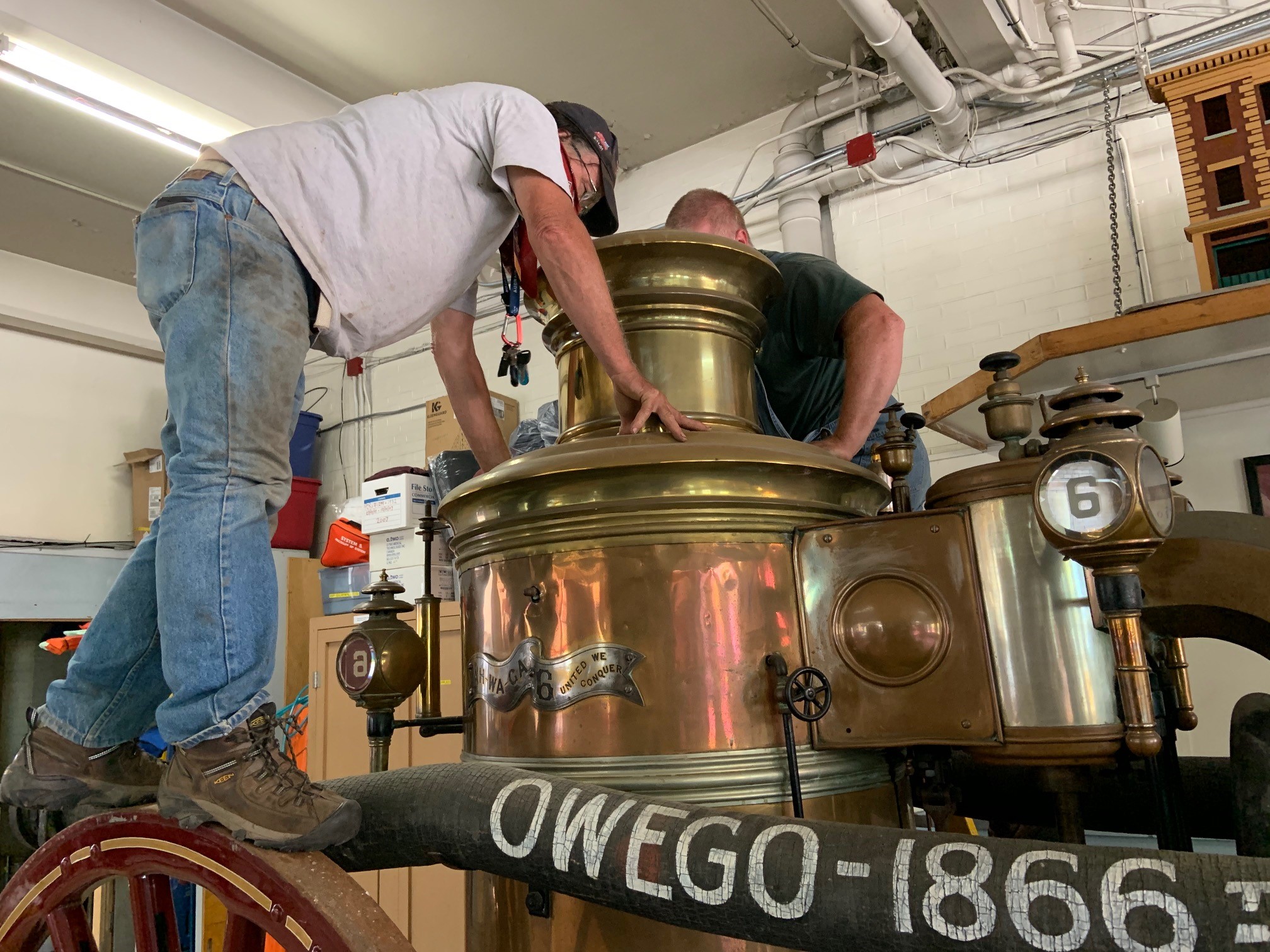 Andy Swift of Firefly Restorations and Brain Fanslau of Maine Locomotive and Machine Works inspect the Owego Fire Department’s 1866 Steamer. Provided photo.