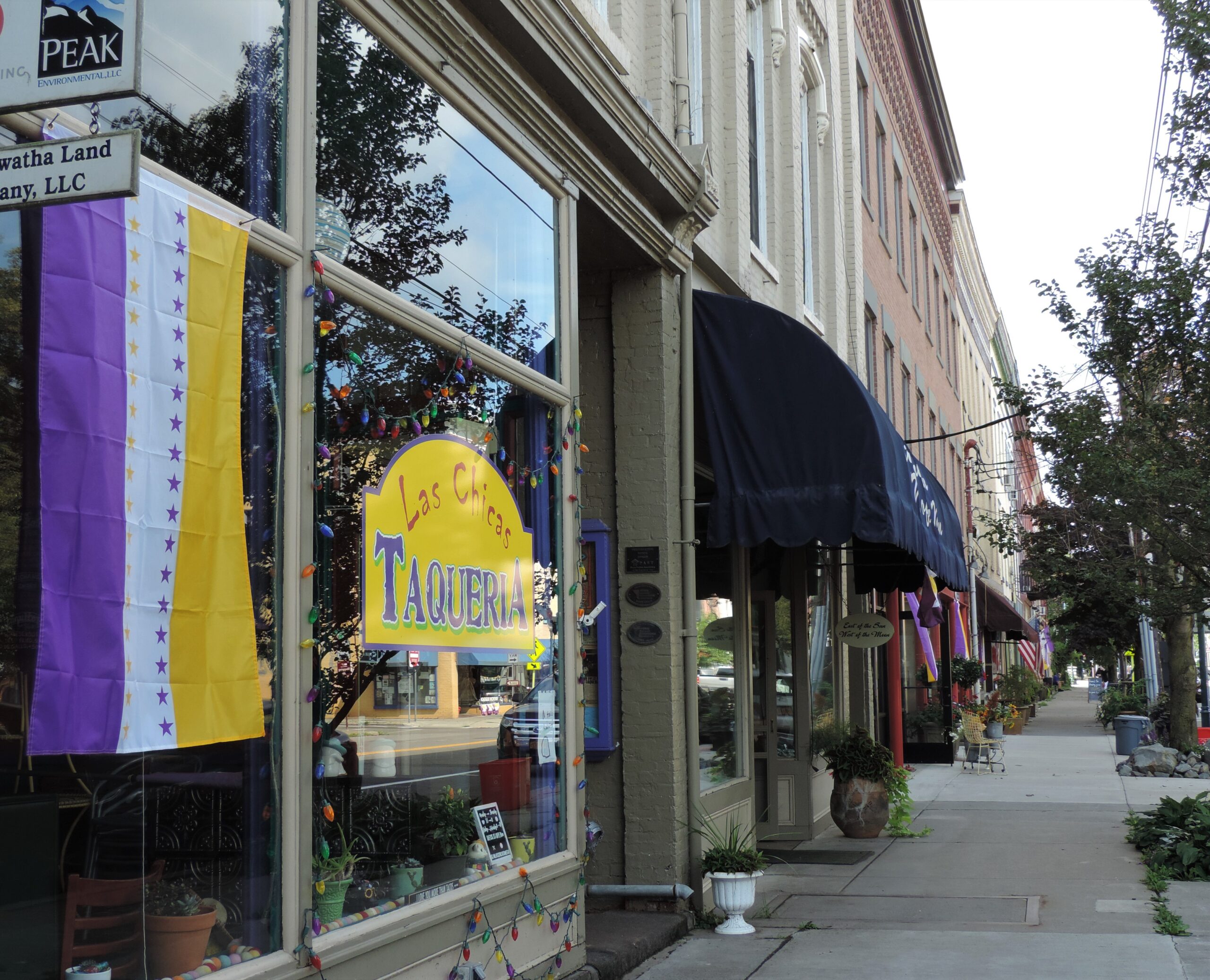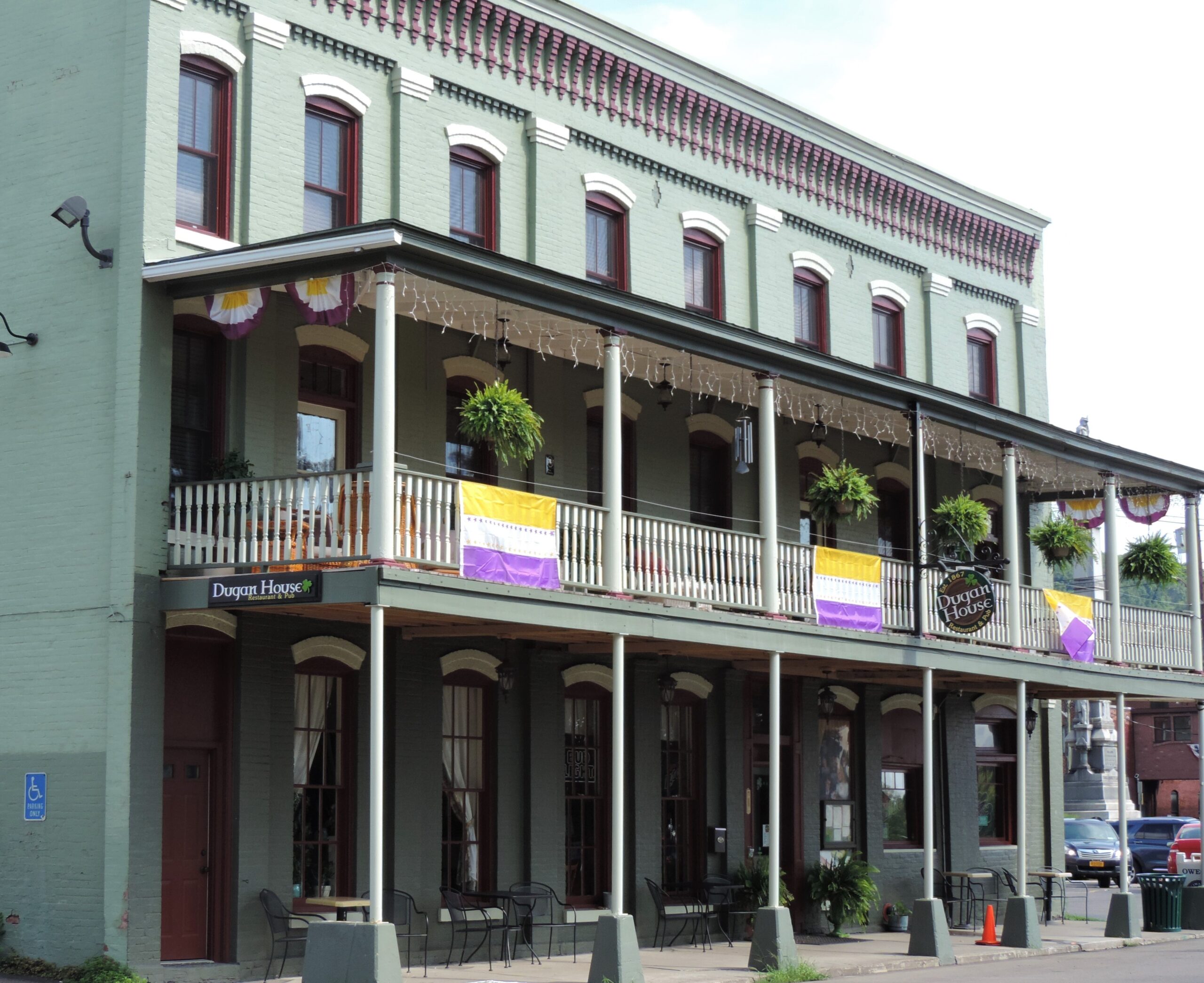 Owego’s Historic Parkview Inn and Dugan House Restaurant, located at 145 Front St., greets visitors and traffic coming across the Court Street Bridge. The Parkview is one of the many businesses, notable landmarks, and residences displaying the victory flag to commemorate the 100th anniversary of the ratification of the 19th Amendment. (Photo by JoAnn R. Walter)