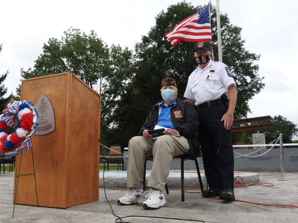 Dean Morgan, veteran and VFW Post 1371 member, addresses guests at the 9/11 ceremony held last Friday. Seated is Jim Raftis, Sr., emcee. (Photo by Wendy Pot)