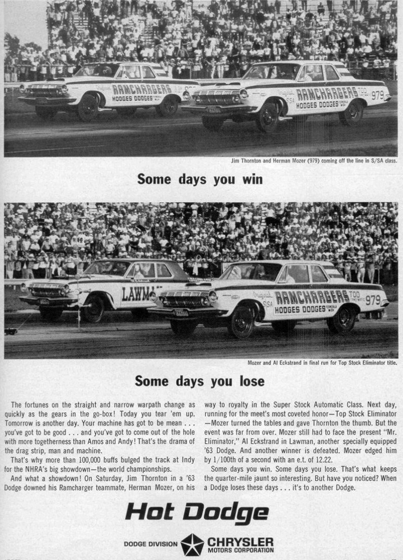 Back in 1963, Dodge promoted its winning ways on the drag strip with its famous “Some Days You Win; Some Days You Lose” print ad. Even though the name Moser is misspelled (Mozer is incorrect), Dodge got the message across it was all-in on racing. (Compliments Fiat Chrysler)