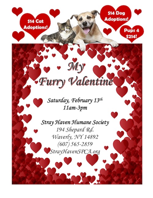Stray Haven Humane Society and SPCA, located at 194 Shepard Rd. in Waverly, N.Y., is holding their second annual adoption promotion, My Furry Valentine, scheduled for Saturday, Feb. 13 from 11 a.m. to 3 p.m. Adult dogs and cats will be $14, and $214 for puppies. All animals made available for adoption will be spayed and neutered, vaccinated, micro-chipped and de-wormed, and treated for fleas and ticks. Provided photo.