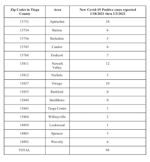 In the meantime, Tioga County is at 2,590 confirmed cases, to date, and a total of 67 COVID related deaths, to include the three deaths reported last week. (Note: we had an additional death reported after we went to print, so the number is now 68.) The county also offered a breakdown of new cases for the period of Jan. 28 through Feb. 3, 2021, and which area in the county they reported in (image attached).