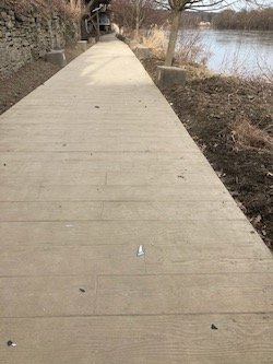 Debris from the accident was found on the Riverwalk below the accident scene on Tuesday afternoon. (Photo by Scott Armstrong)