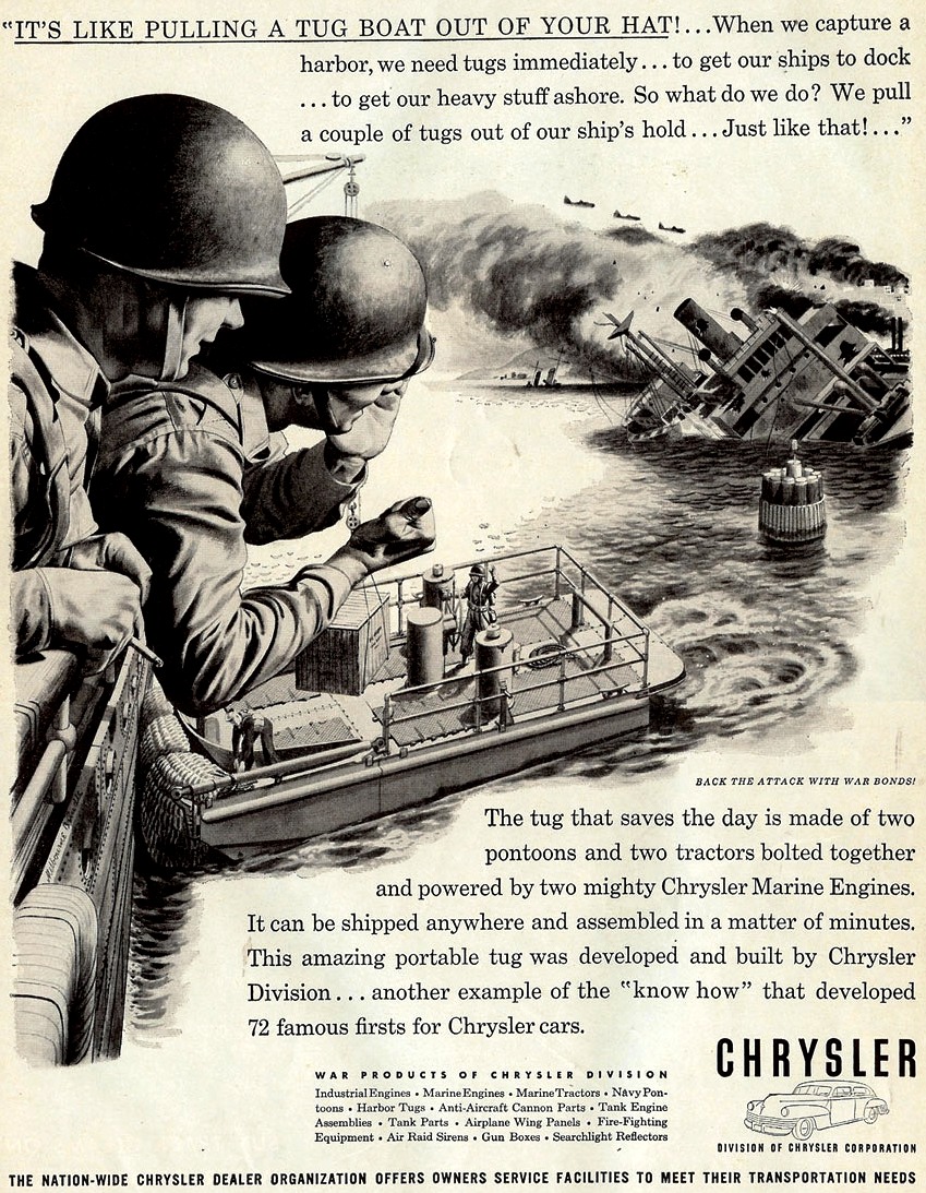 Chrysler was noted for production of military necessities; from ammunition to tug boats, to airplanes during WWII. Its advertising clearly emphasized the company’s military backing. (Compliments Chrysler)