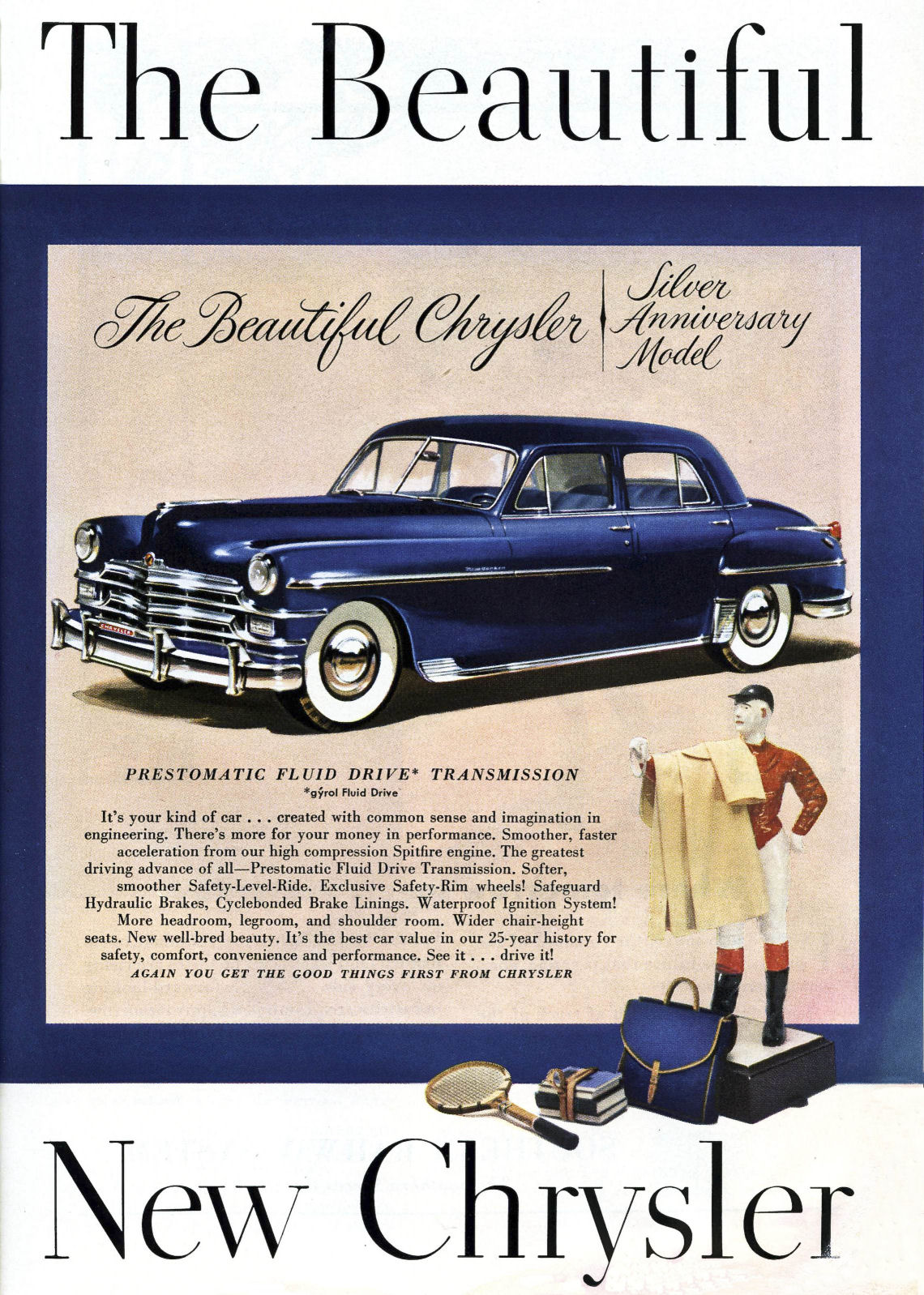 Between late 1945 and early 1949, aside from the stunning Town and Country, all Chrysler models were built largely unchanged. Although Chrysler’s sales brochure praised their performance and beauty, postwar buyers wanted more comfortable and durable family cars. Chrysler offered solid body construction and the use of quality materials, and was considered superior to that of the competing General Motors and Ford models.