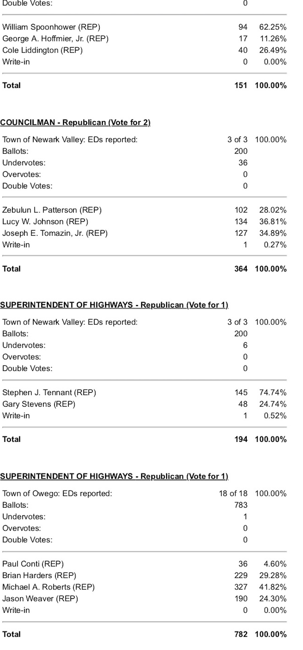 One of its most highly contested races, Superintendent of Highways for Owego, saw Michael A. Roberts come out in the lead with 41.82% of the vote; Brian Harders and Jason Weaver followed with 29.28% of the votes and 24.30% of the votes, respectively; and Paul Conti brought in the remaining votes.