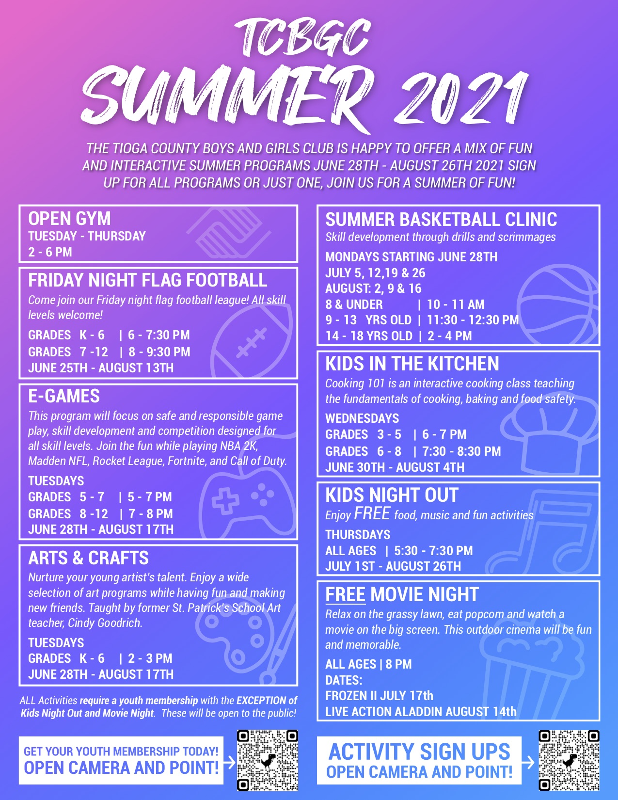 The Tioga County Boys and Girls Club, located at 201 Erie St. in Owego, N.Y., is offering a mix of fun and interactive summer programs starting June 28 and running through Aug. 26.