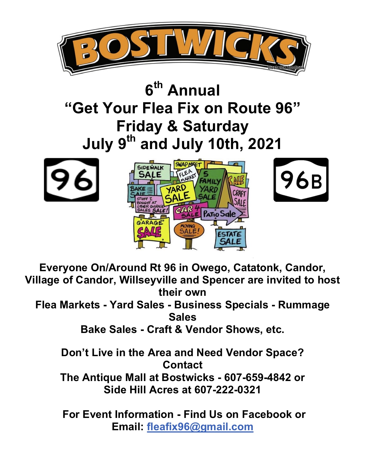 ‘Get Your Flea Fix on Route 96’ taking place July 9 and 10Bostwick Antique Mall and Auctions is offering vendor space at their 1121 Owego Rd. location in Candor, N.Y., and at Side Hill Acres, located at 79 Spencer Rd. in Candor. For more information about vendor space at Bostwick’s, call (607) 659-4842. To learn more about vendor space at Side Hill Acres, call (607) 222-0321.