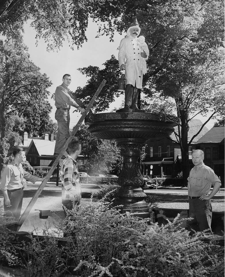 DID YOU KNOW? The Baker Fireman’s Fountain located in the Courthouse Square and the clock tower atop Owego Central Fire Station were gifts to the Village of Owego and its firefighters by past Owego Fire Chief Frank M. Baker. Modeled by Caspar Buberl and sold by J.W. Fiske, the fountain type is called the “Fiske Fireman.” Fourteen zinc statues of firemen similar to the one in Owego are located across the United States.