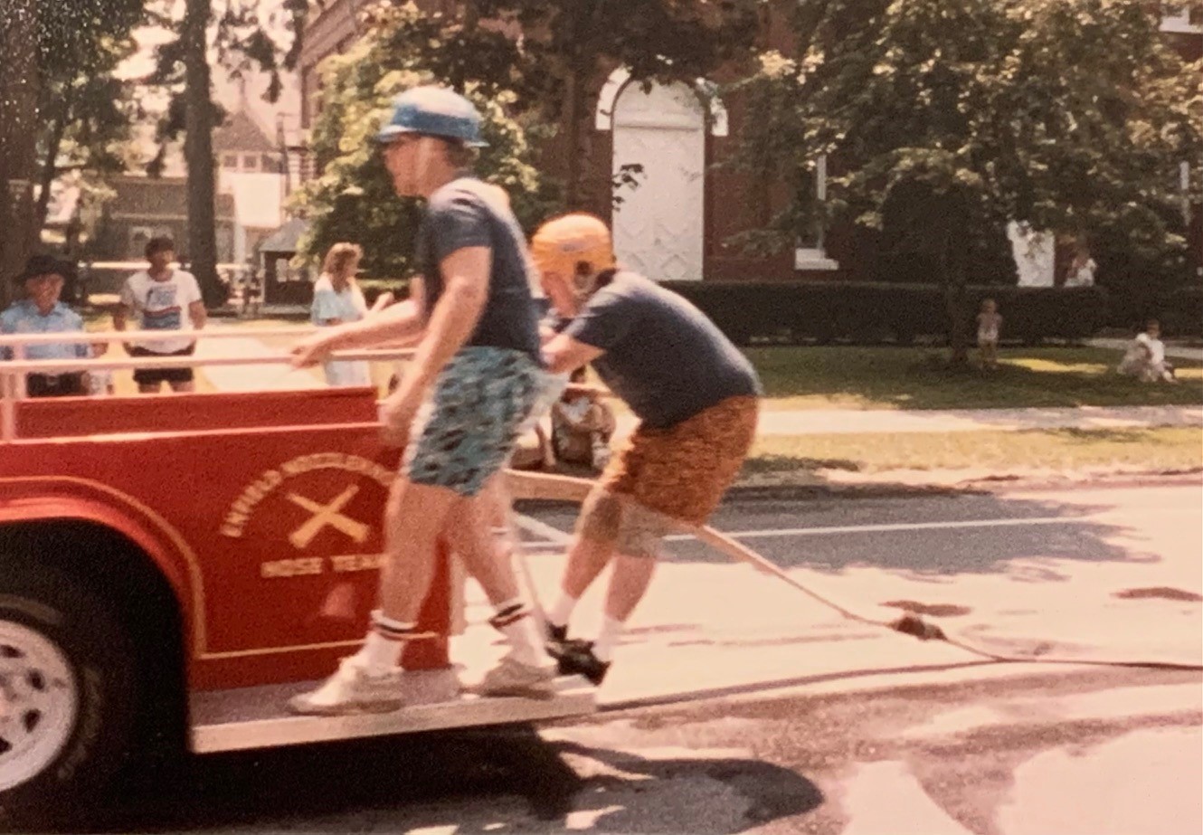Hose team members Joe Renda and Mike Bidwell participate in the equipment efficiency race during the 1995 convention on Temple Street.