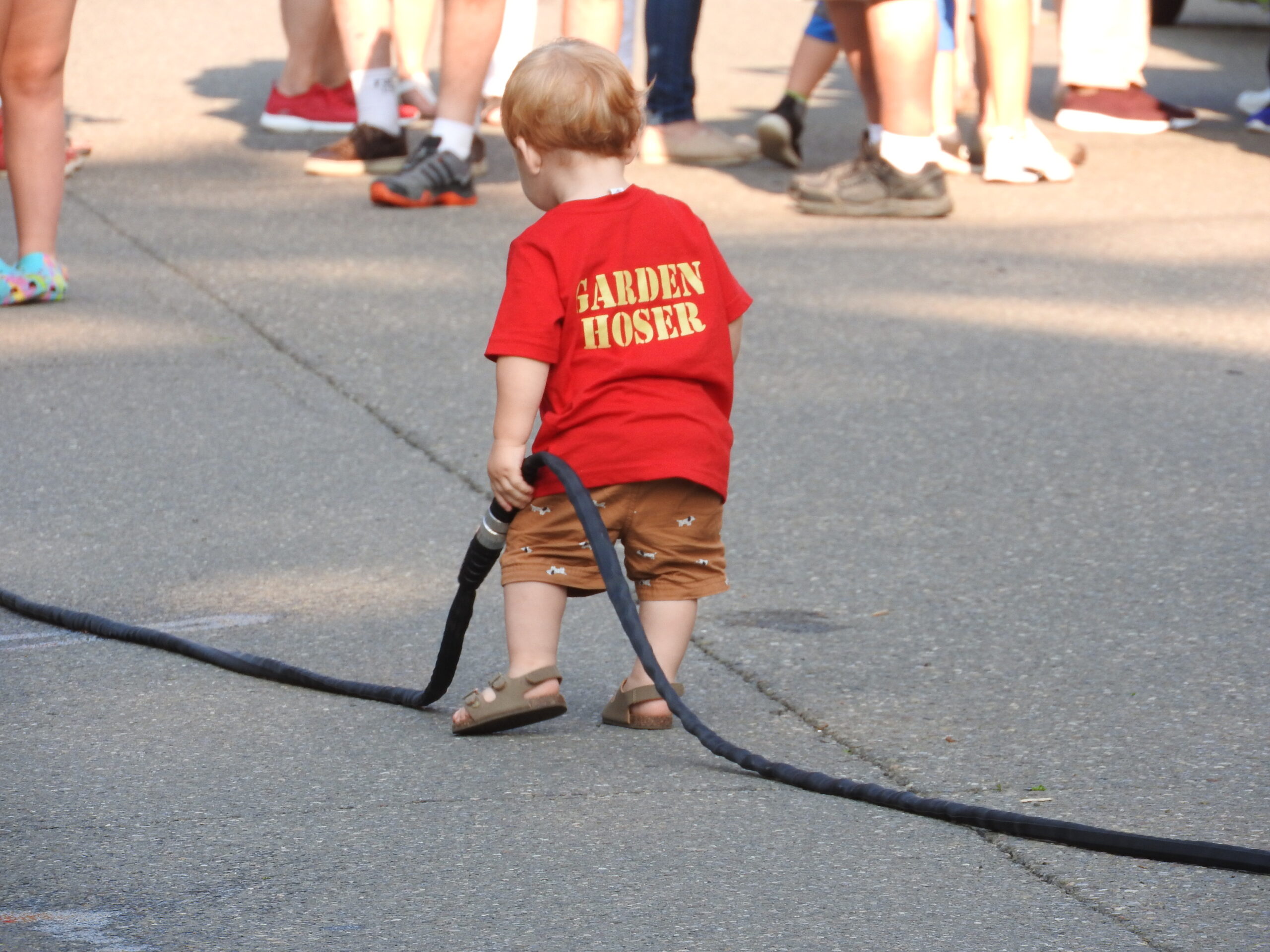 A young Gavin, inspires to be a future Hose Race champion. Here he is pictured during Friday Night’s Block Party, held in The Flats in Owego. (Photo by Wendy Post)