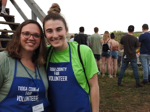 Pictured, Jennifer Schecter, of Candor, N.Y. and NP at Guthrie in Sayre, and Charlsie Bowen, Mansfield University graduate and volunteer, spend time at the grandstands on Friday evening at the Tioga County Fair in Owego, N.Y. The two signed up to volunteer through the Owego Gymnastics and Activity Center in which Bowen’s mother, Jana Bowen, serves as executive director. (Photo by Wendy Post)