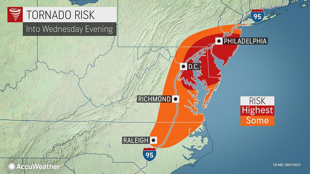 According to an update from AccuWeather Wednesday afternoon, Ida is unleashing very heavy rainfall and significant flooding along and north of its track, while damaging thunderstorms and isolated tornadoes are the primary concern to the south and east of the storm track. Earlier Wednesday there was a tornado that touched down in the Annapolis, Maryland area.