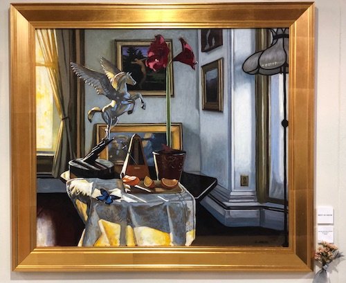This year’s Award Winners are Best in Show – “Still Life with Blue Butterfly” by Brian Keeler; Painting – “Summer Cloud” by Kevin Fahey; Photography – “Construction Site” by Kim Shienbaum; Sculpture – “Metropolis Queen” by Andrew Fitzsimmons; Fiber – “Aunt Jemima” by Julie Thurber; Clay – “Strawberry Field Jar and Pitcher” by Rachel Consolazio; Wood – “Reliquary” by T. Benjamin Hobbs; and Mixed Media – “Nature’s Tapestry” by Sonji Lee. Honorable Mentions included “Feather Your Nest” by Chris Knickerbocker; “California Pince-Nez Brooch, Pince-Nez Lips with Pearls, Pince-Nez Sea Shells” by James Malenda; and The Betty Bryden and Tom Canouse Award – “Late Summer on the Porch” by Laura Jaen Smith.
