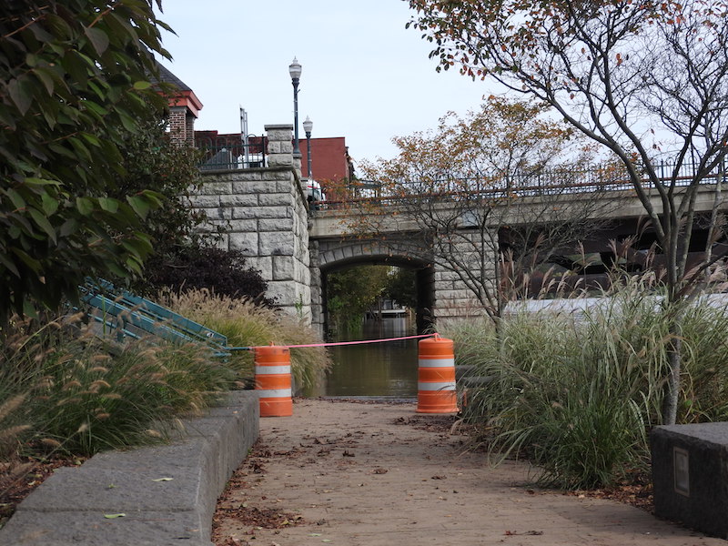 By Tuesday afternoon, the north side of Hickories Park was closed off as waters from the creek began to rise. This forced the immediate closure of The Rebecca Weitsman Memorial Dog Park, the soccer fields, and all of the amenities over the bridge by the Traci’s Hope Pavilion. By evening the entire park was blocked off at the main entrance by Town officials.