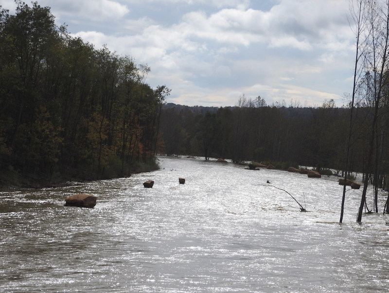 The Susquehanna River in Owego was reaching near Active Stage on Wednesday, and following the steady rainfall. Although this riverbank is higher up, low-lying areas of the river saw flooding, and its tributaries were bursting at the seams. (Photo by Wendy Post)