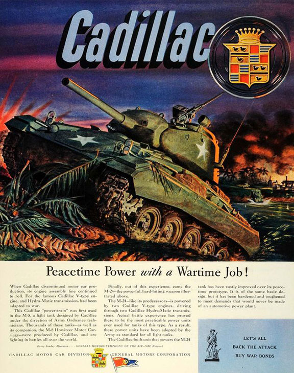 Cadillac was very aggressive with its war era advertising, letting the public know its engines were powering many combat tanks. General Motors had the most military contracts overall, and produced a long line of military hardware. (Compliments Cadillac)