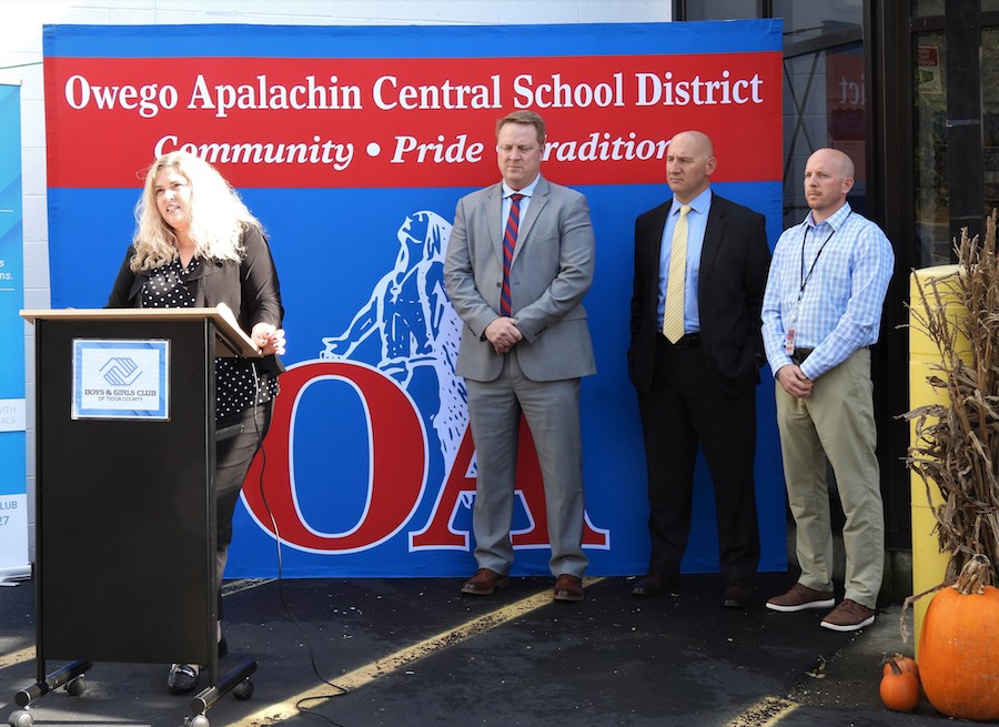 Jill Teeter, executive director of the Tioga County Boys & Girls Club, alongside Corey Green, superintendent of the Owego Apalachin School District, and other school officials, speaks to guests on Oct. 25, 2021 about the official kick-off of a partnership between the club and school district. The club will open their doors weekdays from 3 p.m. to 5 p.m. for a free program for Owego-Apalachin students in grades 3 through 6. The program begins Nov. 8. (JoAnn R. Walter Photo)
