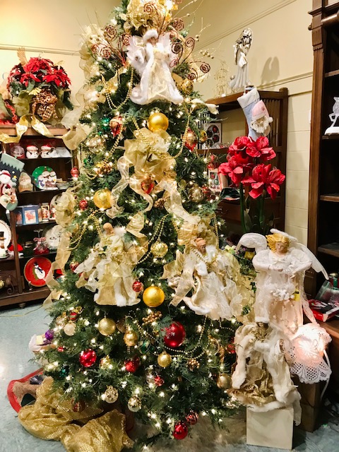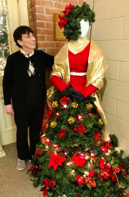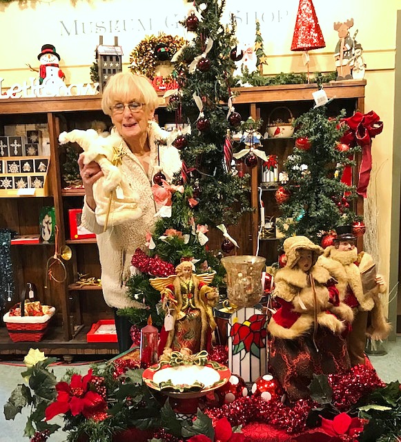 Pat Hansen, former owner of The Hand of Man in Owego, was one of the volunteers helping to set things up at the museum this year for the O Tannenbaum Showcase and Auction. Here, Hansen helps decorate the museum’s gift shop. Photo credit: Sister Chirya.
