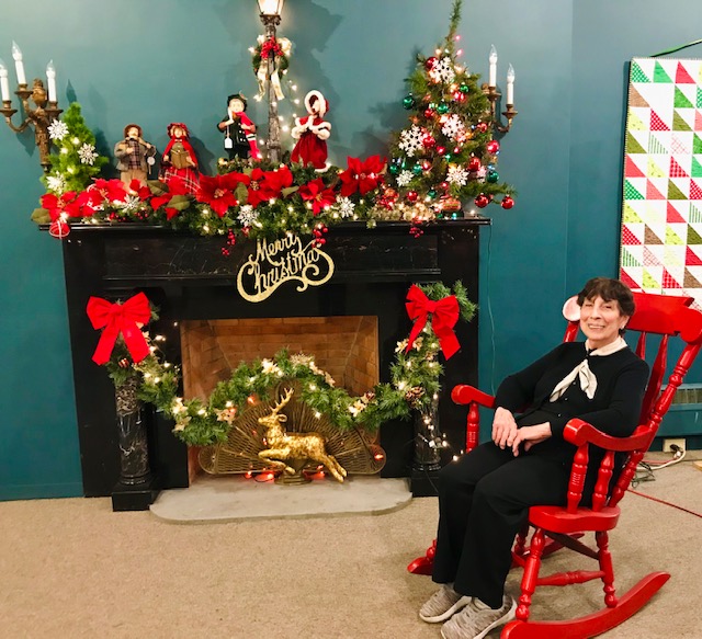 Emma Sedore, Tioga County historian, relaxes by the fireplace while getting ready for O Tannenbaum. Photo credit: Sister Chirya.