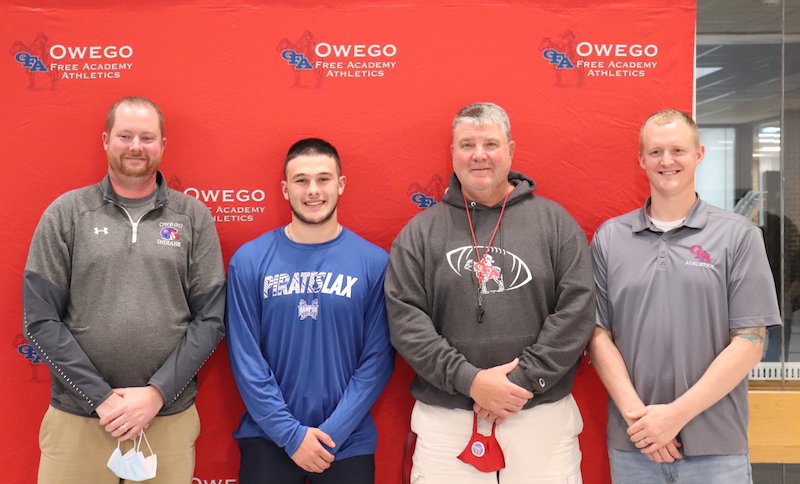 Matt Gatto, senior at Owego Free Academy, signed a Letter of Intent on Nov. 12 at the OFA Lobby. Here, he is pictured with the Lacrosse Coach, Andy Race; Football Coach, Steve Virkler; and Wrestling Coach, Nick Rodgers. Matt has been a member of the varsity lacrosse team since his freshman year and currently plays defense. As a junior, Matt was named a 2nd team all division defender. He will be attending Hampton University, a private school in Virginia, to play D1 lacrosse. Provided photo.