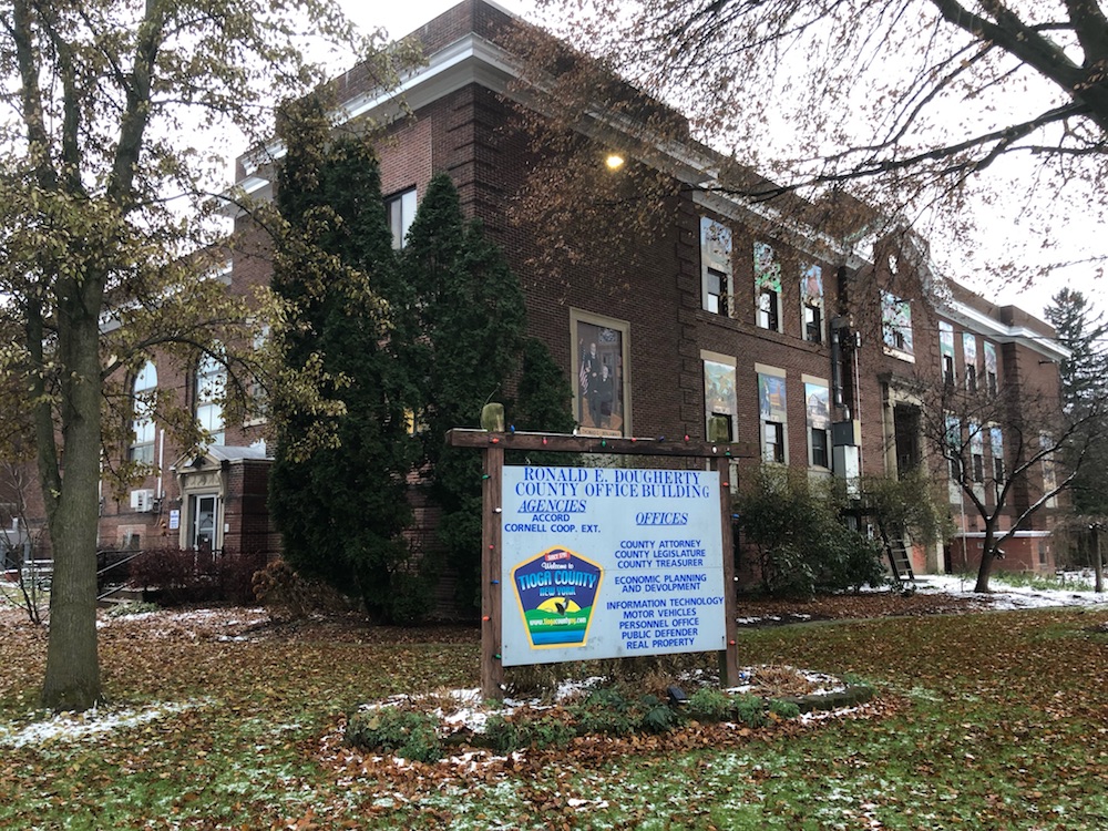 Pictured is the sign that sits in front of the Tioga County Office Building in Owego, N.Y. that bears Ronald Dougherty’s name. The building was named in honor of Dougherty in 2014. (Photo by Wendy Post)