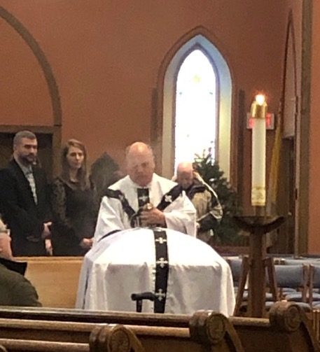 Jeffrey Galens of Blessed-Trinity Parish, incenses the casket at St. Patrick’s Church in Owego as a sign of reverence, and then states, “In peace, let us take our brother to his final resting place.” (Photo contributed by Jim Raftis, Sr.)