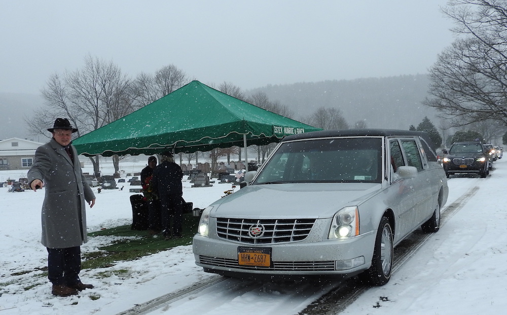 The funeral procession for Ronald (Ron) Dougherty arrives at Maple Grove Cemetery in Candor, N.Y. on Tuesday. (Photo by Wendy Post)