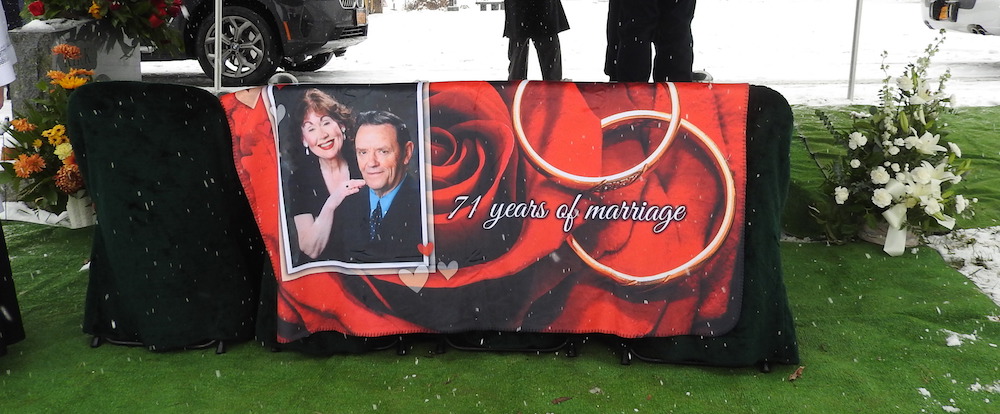 His grieving wife of 71 years was directly behind the hearse, and was led to the graveside by family members. The director of the Estey Munroe and Fahey Funeral Home placed a blanket they made that commemorates Brenda and Ron’s 71 years of marriage on Brenda’s lap to keep her warm, while graveside services were led by Father Jeffrey Galens of Blessed-Trinity Parish and St. Patrick’s Church.