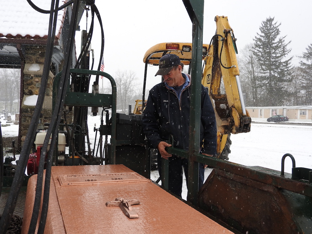 Mark, from The Fort Miller Service Corp. out of Binghamton, N.Y. delivers the burial vault to the graveside at Maple Grove Cemetery in Candor, N.Y. on Tuesday, and to the site of Ronald Dougherty’s final resting place. (Photo by Wendy Post)