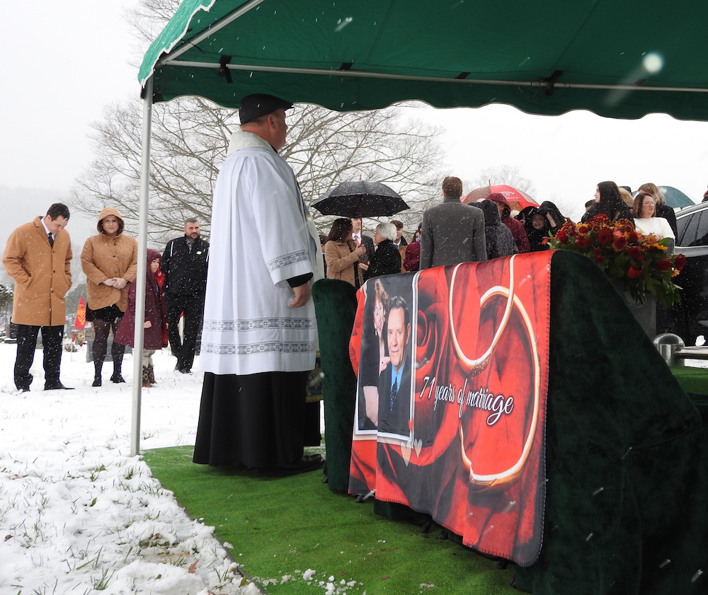 At Maple Grove Cemetery in Candor, N.Y., the final resting place for Ronald Dougherty, a procession on Tuesday arrived around noon from St. Patrick’s Church in Owego. Once there, a tent that covered the vault where Dougherty’s coffin rested and where the service took place kept things dry, as snow was falling at a heavy pace.