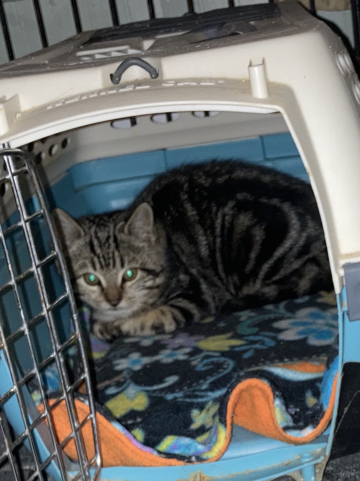 Two days ago a mystery kitten showed up. A little black fur ball with bright blue eyes showed up to play with Baby. Momma was not around but the two kittens played together in the parking lot behind the theater. I set a trap outside of one of the shops and lo and behold I was able to trap Baby! I brought her home and secured her in a safe and warm shelter with a soft and warm bed for the night.