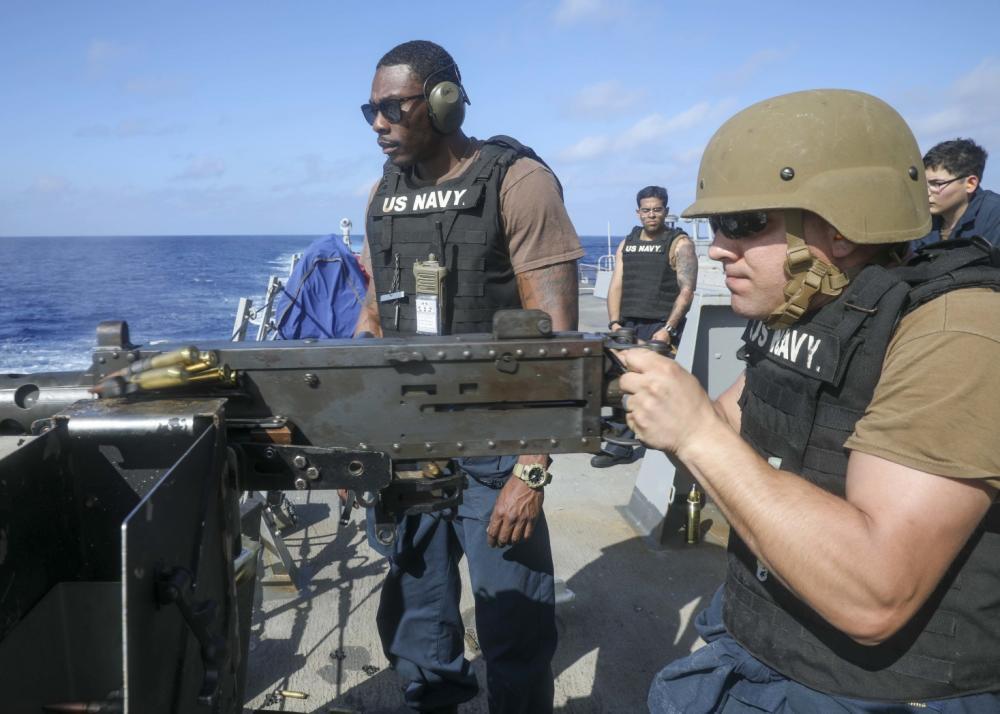 Pictured, Fire Controlman 2nd Class Darron Perry, from Lisle, N.Y., fires a .50 cal. Machine gun during a crew-serve weapon familiarization on the fantail of Arleigh Burke-class guided missile destroyer USS Benfold (DDG 65).