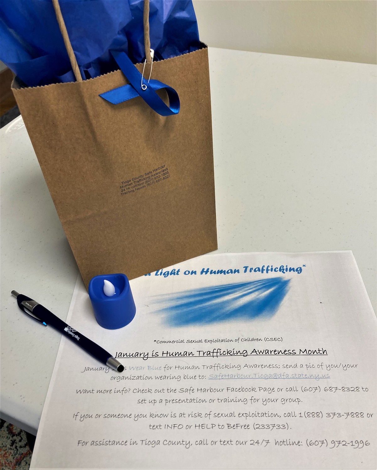 To participate, you can display a blue light in your home, workplace, or place of worship. Tioga County Safe Harbour is distributing free blue lights and information about trafficking to all community members. Lights are available at the Tioga County Health and Human Services Building, the Tioga County Child Advocacy Center, and A New Hope Center.