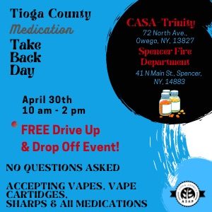 The Tioga County Advocacy, Support, and Prevention (ASAP) Coalition is inviting Tioga County residents to join them on April 30 for National Drug Take Back Day, a day to bring back unused or expired medications, as well as used vapes and vape cartridges.