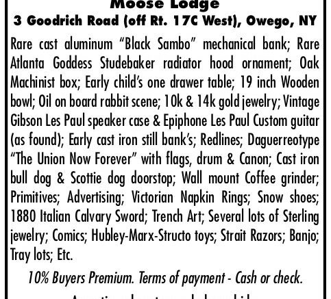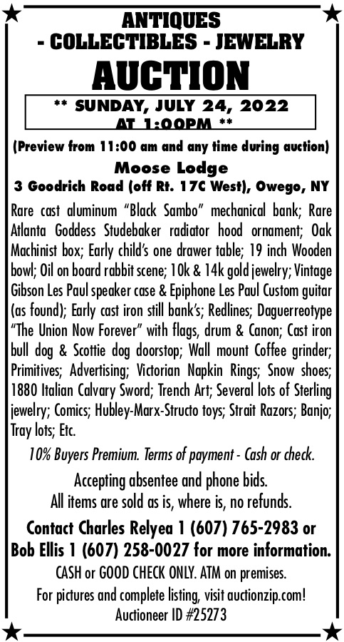 Antiques, Collectibles, and Jewelry Auction at the Moose Lodge; July 24 Posted By: psadvert July 21, 2022