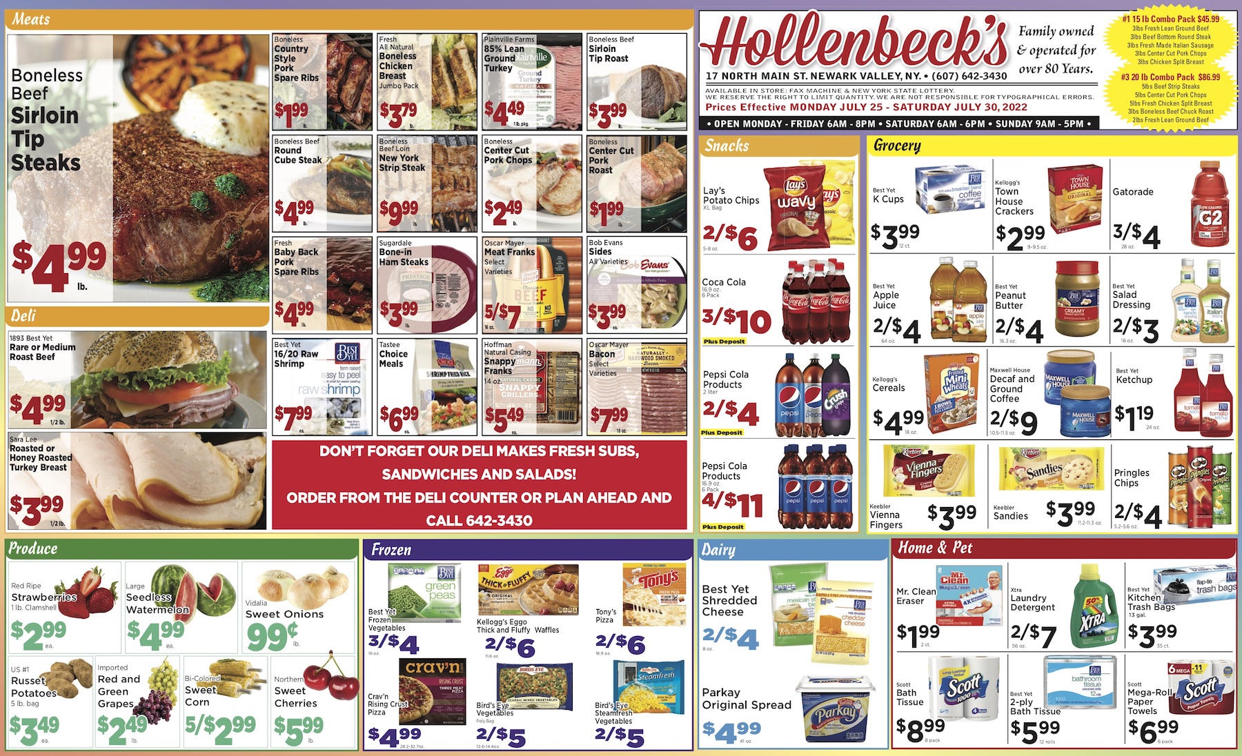 Hollenbeck’s of Newark Valley; Weekly Specials for July 25-July 30 Posted By: psadvert July 23, 2022 (Click the Ad to enlarge!)