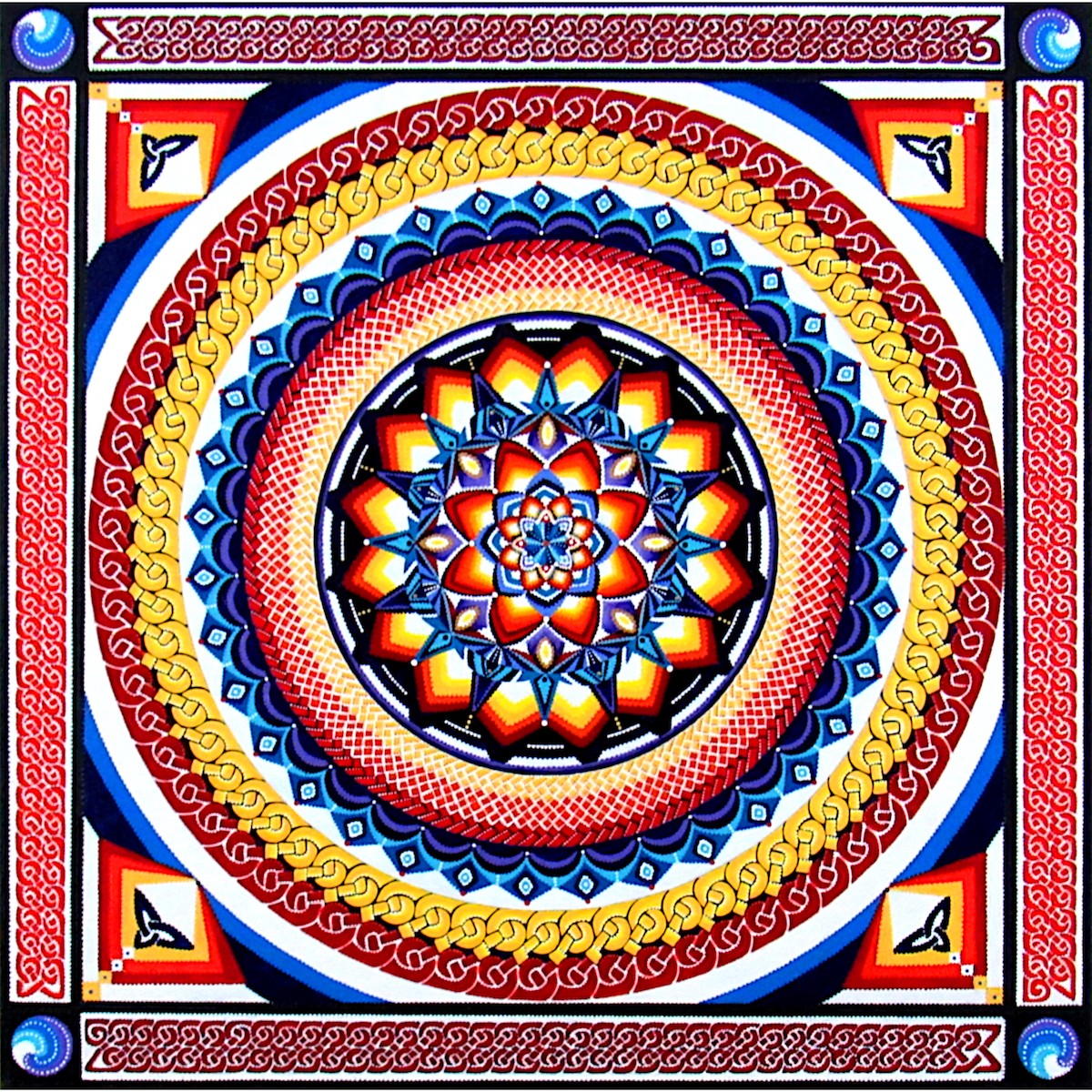 Celebrating the wonder of these sacred elements, bold and unique hand painted mandalas are created. Each is delicately woven with intricate Celtic/insular knot work, integrating spiritual and artistic practice with the diverse threads that transverse the centuries back to ancient Europe and a time when art was an expression of the purest devotion to Divine immanence.
