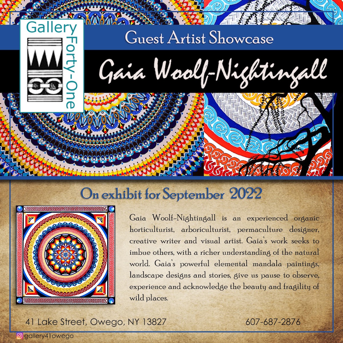 Gallery 41 announced a new guest artist for the month of September. Gaia Woolf-Nightingall is a British born, experienced organic horticulturist, arboriculturist, permaculture designer, creative writer, and visual artist.