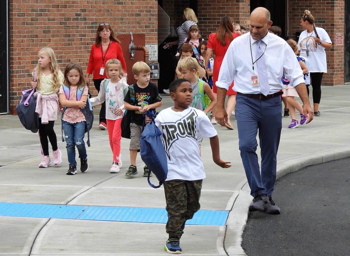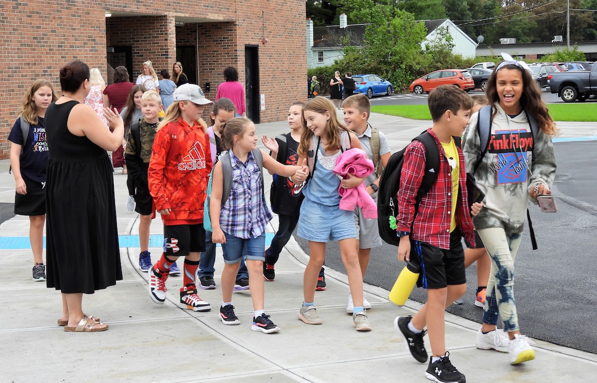 Staff members escort and welcome students back to school at Owego Elementary on Sept. 7. (JoAnn R. Walter Photo)