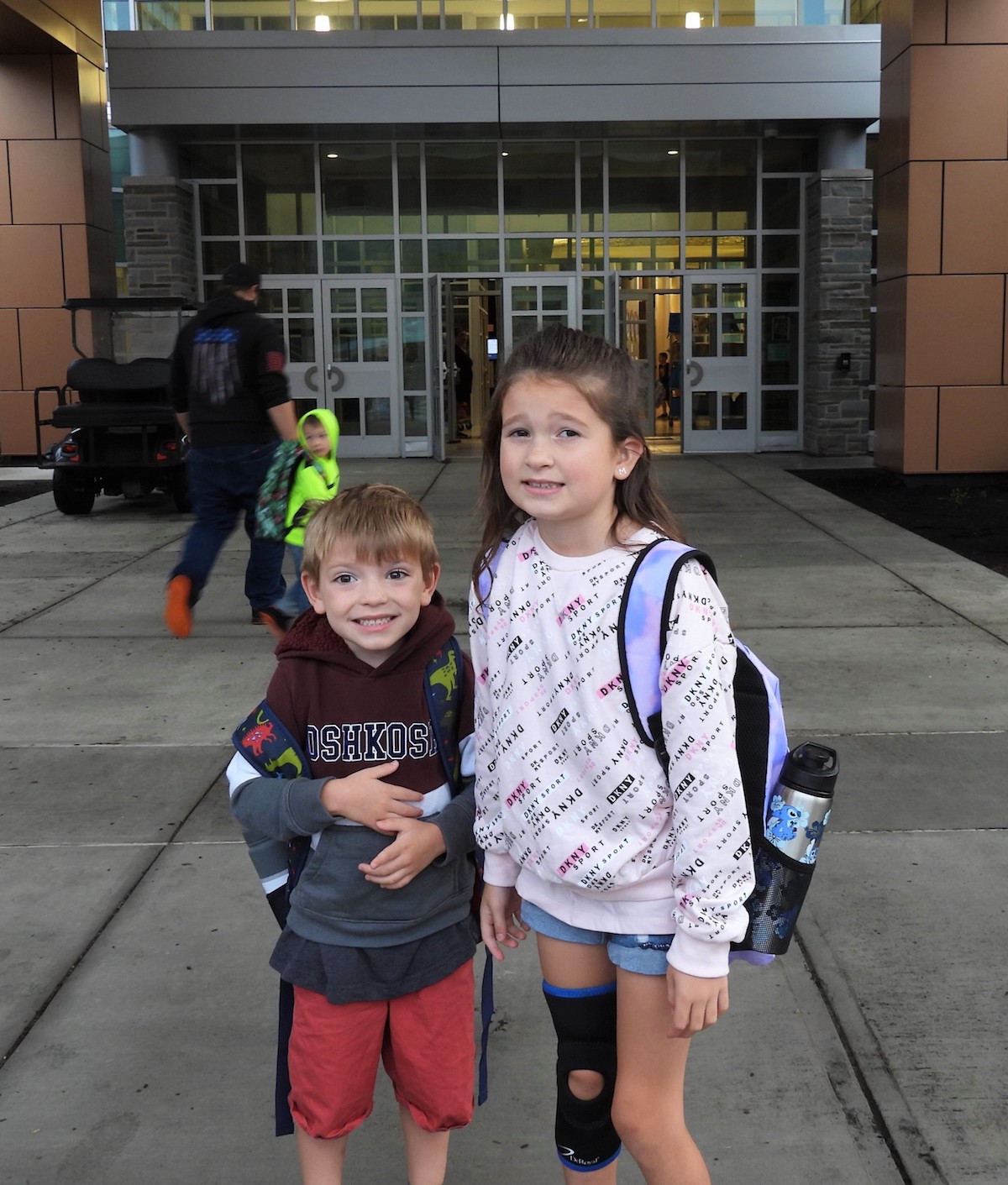 From left, Carson Schofield and Madison Bricker arrive for their first day of school on Sept. 7 at Owego Elementary. Carson was ready for Kindergarten, and Madison started third grade. (JoAnn R. Walter Photo)