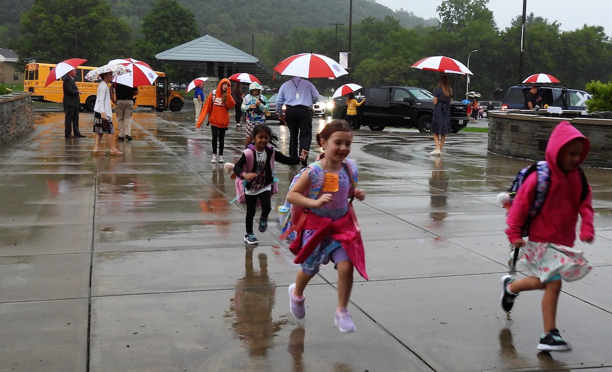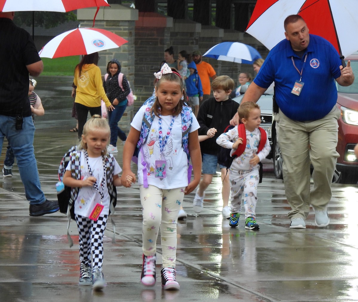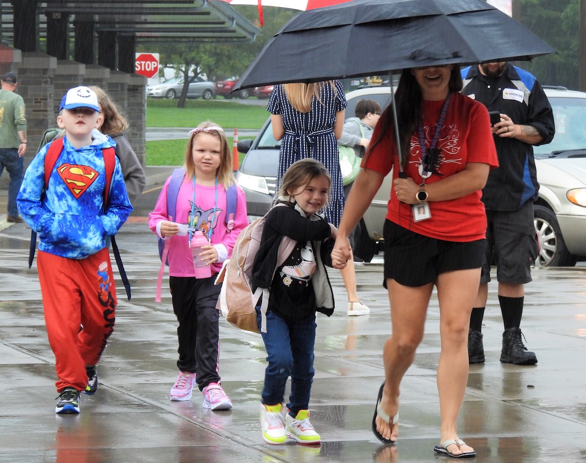 School administrators and elementary staff members who had umbrellas ready in hand greeted students. There were plenty of hugs by parents dropping off their children, and several last-minute first-day-of-school photos.