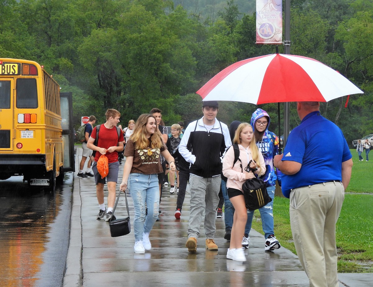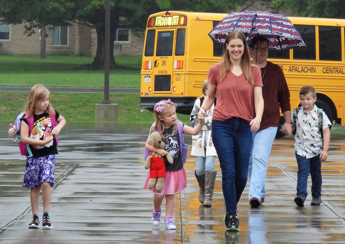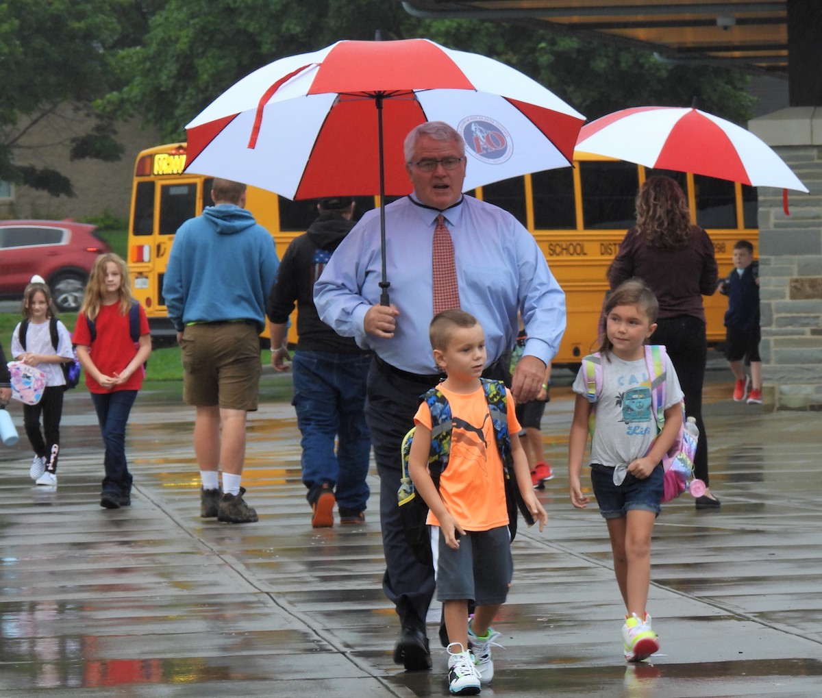 School administrators and elementary staff members who had umbrellas ready in hand greeted students. There were plenty of hugs by parents dropping off their children, and several last-minute first-day-of-school photos.