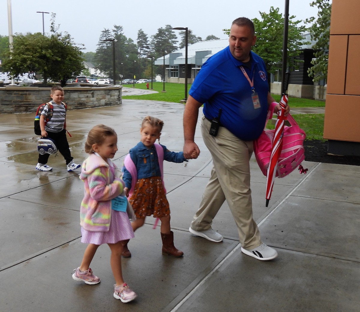 Smiles, handholding, and a little rain on the first day of school at Owego Elementary on Sept. 7. (JoAnn R. Walter Photo)