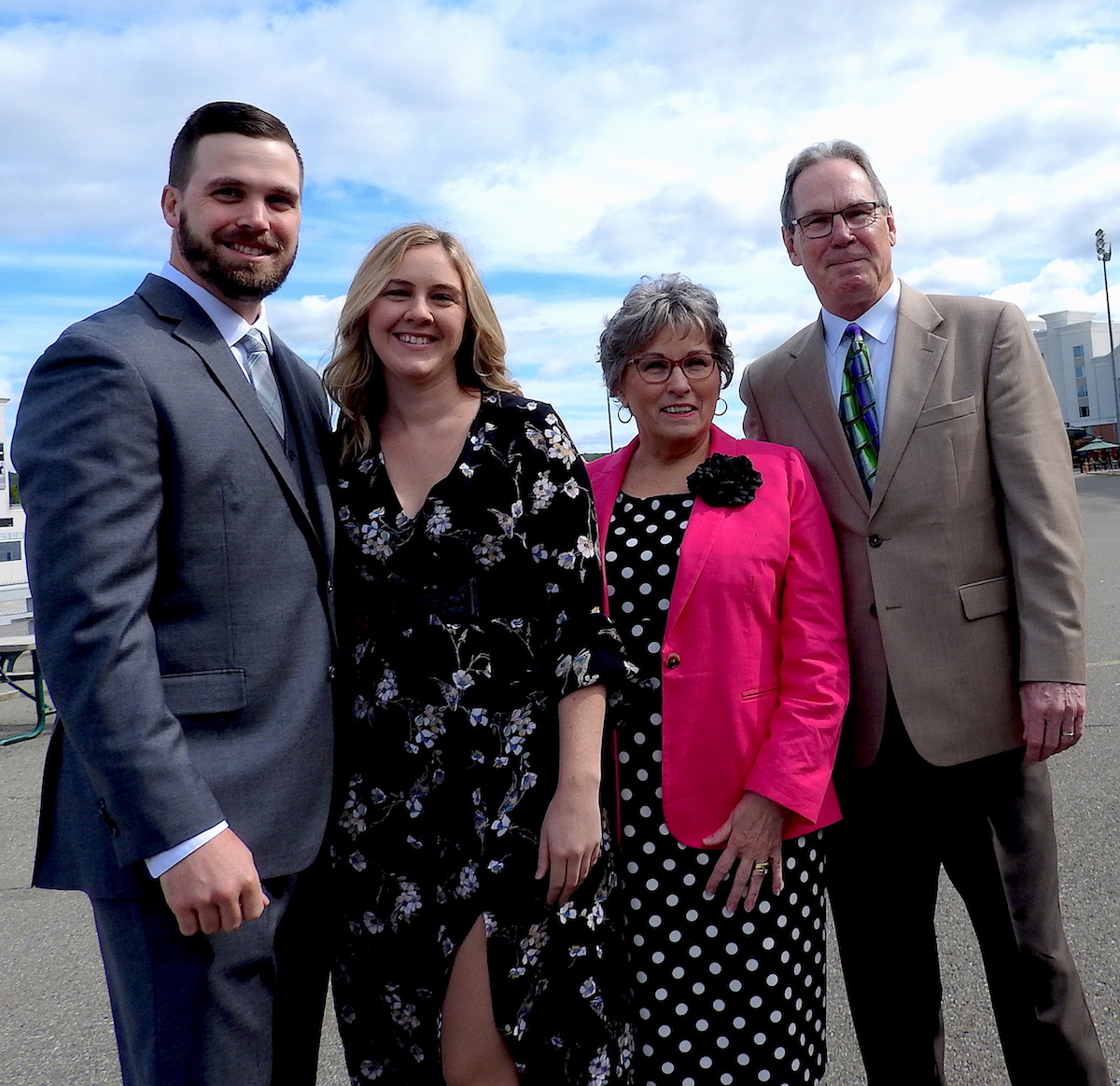 Tioga County’s Chair of the Legislature, Martha Sauerbrey, second from the right, and Dave Woodburn, on the right, greet Thomas and Brittney Woodburn as they arrive at the Chamber Stakes event, held Sept. 24 at Tioga Downs Casino Resort. The event was a kick-off of the Chamber Foundation and an introduction of the Junior Chamber. (Photo by Wendy Post)